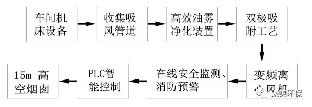 收集系統 →高效油霧凈化裝置 → 雙極吸附工藝 → 風機→在線安全監測、消防預警 →PLC智能控制→ 煙囪(室外寶塔煙囪)